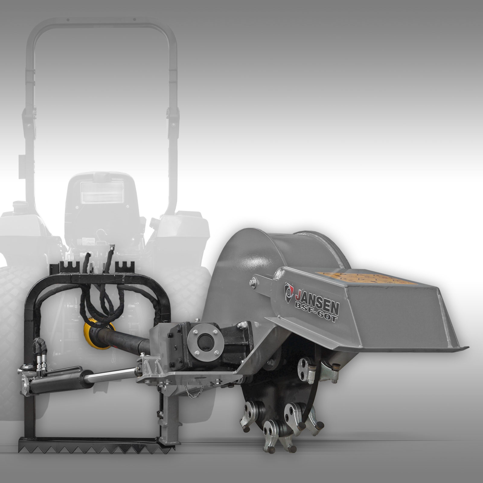 Naše fréza na pařezy BSF-60T je navržena tak, aby se připojila k vašemu traktoru a byla poháněna vývodovým hřídelem (včetně). Základní rám je vybaven tříbodovým závěsem a stabilními podpěrnými nohami.