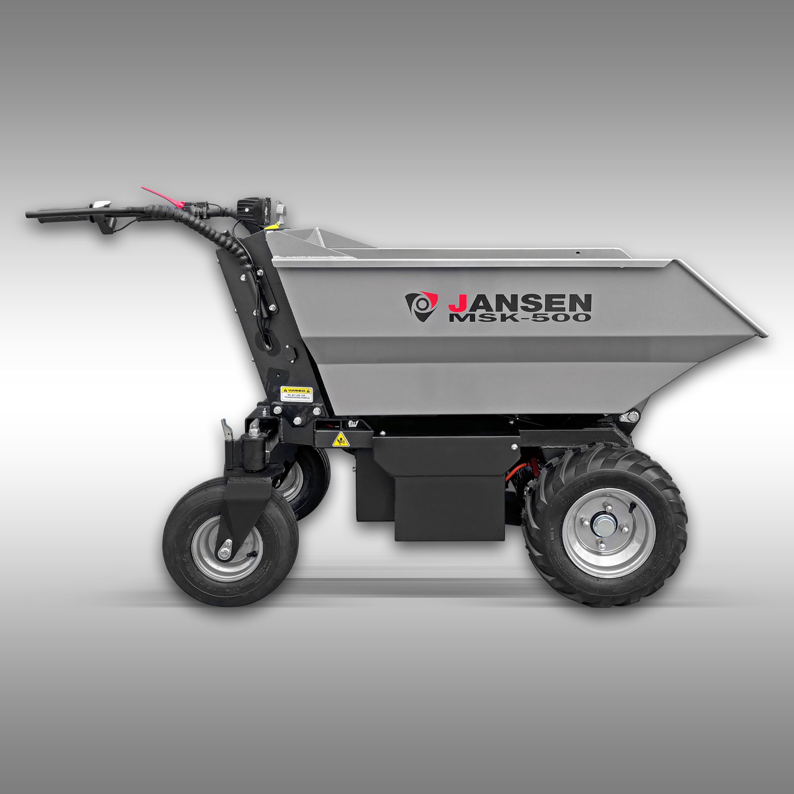 Elektrický sklápěč se vyznačuje působivým výkonem 1 000 W, což vám umožní snadno přemisťovat těžké náklady. Je extrémně výkonný a usnadňuje vám práci. Ať už přemisťujete písek, seno, slámu, nářadí nebo stavební materiál, tento sklápěč si bez problému poradí s každou prací. Náš Jansen MSK-500 zvládne stoupací trasy s maximálním sklonem 15°. To samozřejmě vždy silně závisí na podmínkách terénu a užitečném zatížení motorizovaného trakaře.
