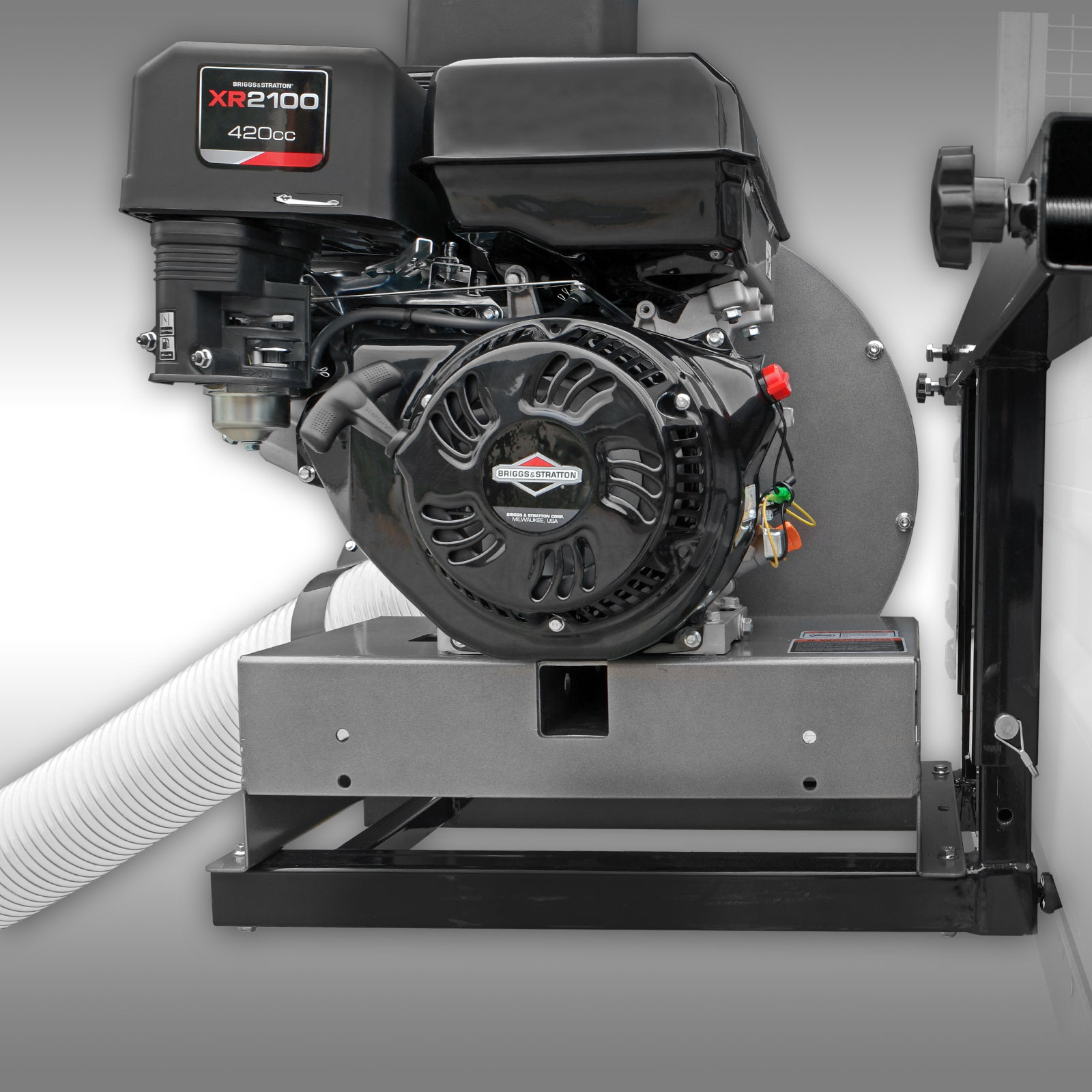 Spolehlivý, výkonný zážehový motor Briggs&Stratton o výkonu 13 HP pohání výkonné turbínové kolo, které je umístěno uvnitř robustního krytu. Turbínové kolo má průměr Ø 400 mm a je vybaveno 4 velkými a 4 malými noži, které zajišťují řezání materiálu na extrémně malou velikost a následné stlačování. Stroj má sací výkon cca 3800 m³/h.