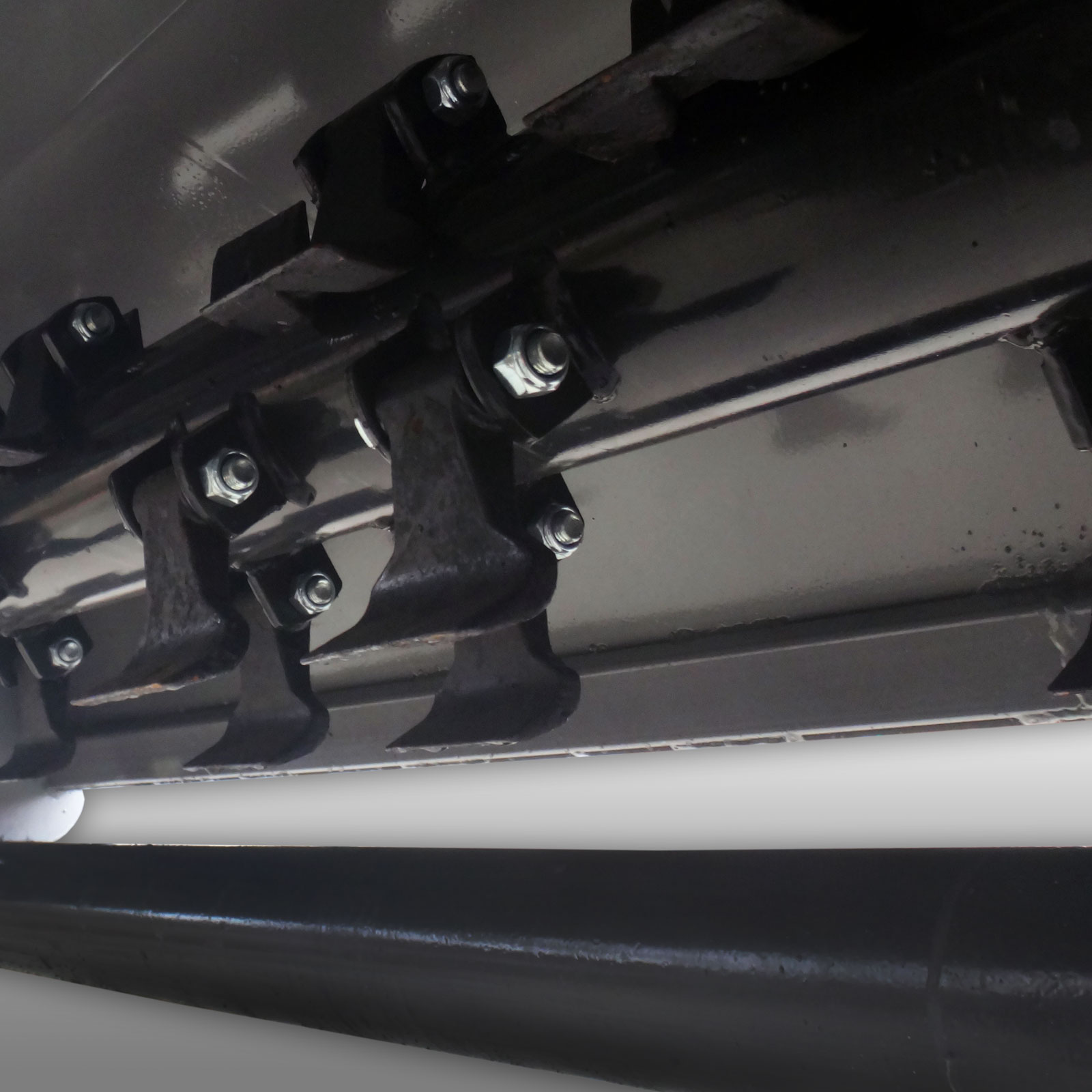 Tato žací jednotka má nejodolnější převodovku ve své třídě. Na rozdíl od žacích jednotek vybavených lehkými noži ve tvaru Y má tato sekačka vysokou setrvačnost generovanou těžkými noži kladiva a těžkou hřídelí. To umožňuje našemu stroji fungovat lépe. 20 speciálně kalených nožů kladiva o hmotnosti 0,4 kg, uspořádaných ve čtyřech řadách kolem hnacího hřídele, rozdrtí odřezky na minimální velikost. Ani velmi vysoká tráva, křovinaté nebo slámovité odřezky nejsou pro tuto sekačku problémem!