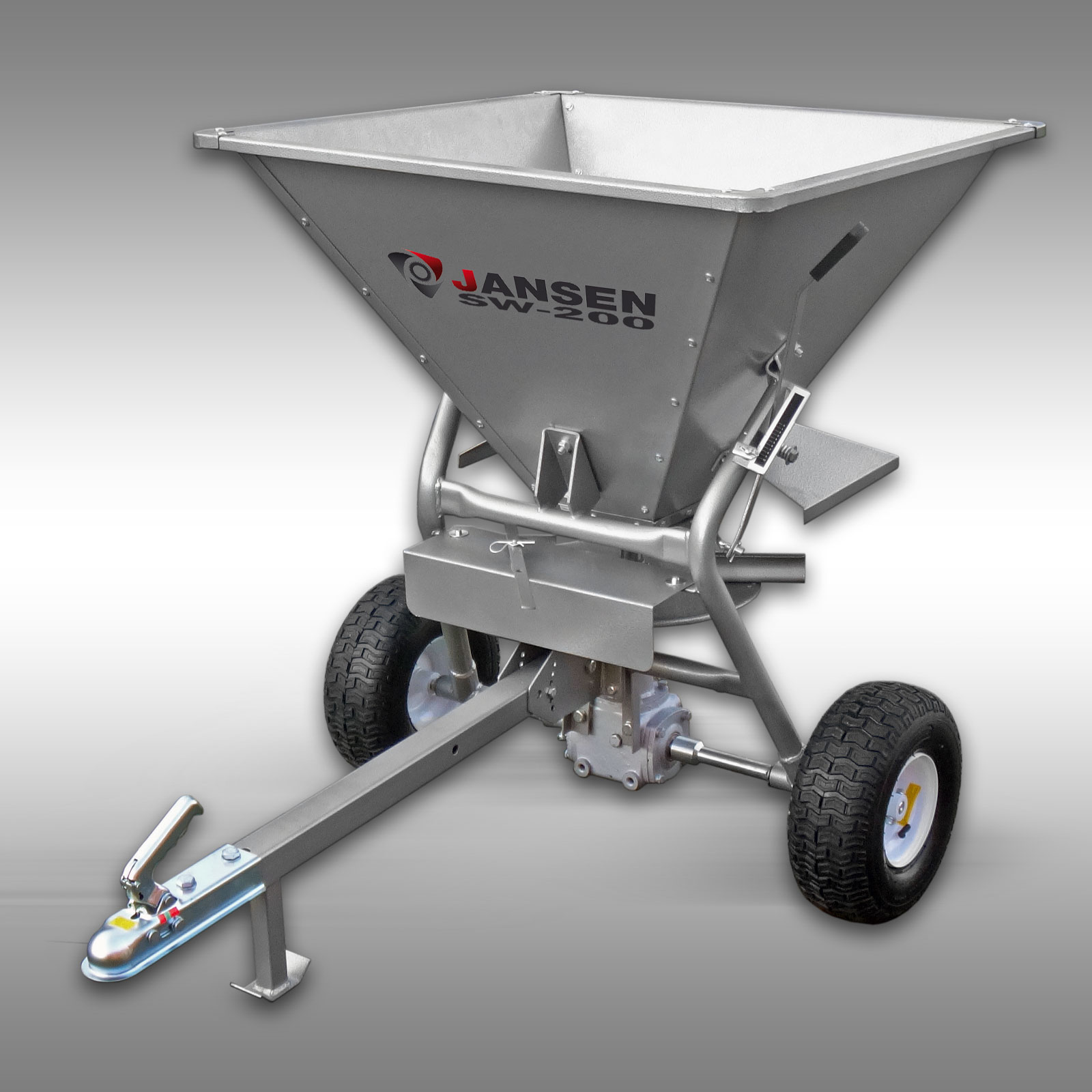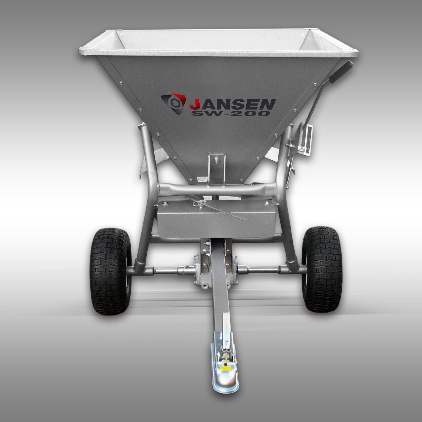 Tažený rozmetadlo Jansen SW-200 (nebo sypač, sypač písku, rozmetadlo hnojiv) má záchytný objem 200 litrů a lze jej pomocí sestavy tažného zařízení táhnout za čtyřkolkou, osobním automobilem, traktorem a dokonce i zahradním traktorem.