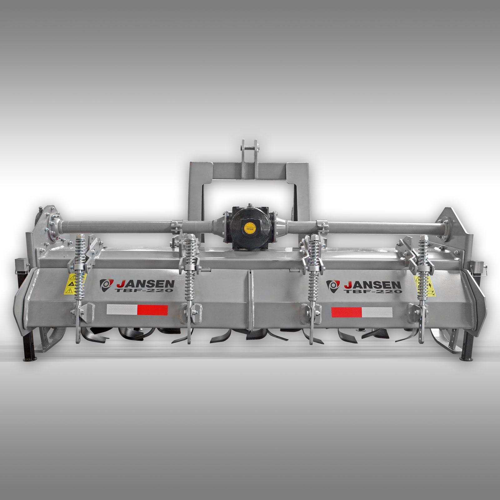 Ať už se jedná o zemědělství nebo polní práce, vinice, sady nebo terénní úpravy – traktorový rotační kypřič Jansen TBF-220 je ideální pro každý druh obdělávání půdy. Oj má speciálně zesílenou úhlovou převodovku a vyznačuje se obzvláště robustní konstrukcí. Hřídel je poháněna ozubenými koly v olejové lázni. Zadní bezpečnostní klapka se zabudovanými urovnávacími pružinami eliminuje nerovnosti v obdělávané půdě a zajišťuje její jemné rozdrcení.